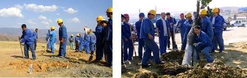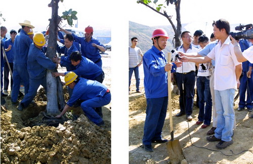 会后,公司领导与100余名职工在烈日下挥镐使铲,在黄磷炉渣露天堆场种下橡皮树、高山榕60余株。
