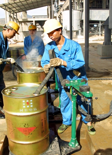 图四:灾情发生后,川投化工号召全体职工“立足本职,加倍努力,以实际行动支援灾区”(图为生产一线职工灌装成品黄磷时情景)。
