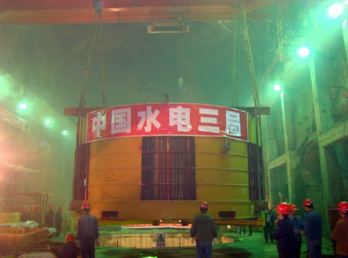 7月17日10时18分,仁宗海水库电站1号发电机组定子顺利吊入机坑,为确保完成2008年度仁宗海电站工程建设目标奠定了坚实基础。