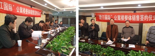 2009年1月19日,双方在beat365正版唯一官网1501室举行了“锦江国际”公寓楼整体销售签约仪式,集团公司三产部经理梅林、副经理薛波等领导代表集团公司出席。在友好的气氛中,房地产公司法人代表王建、委托代理人蔡昌银与四川宏凌公司法人代表冉卫东、委托代理人罗小林共同签订了锦江国际项目公寓楼《商品房买卖合同》和《备忘录》。二月初,已收到宏凌公司支付的第一批购房款。至此,“锦江国际”项目在2009年初成功实现了公寓楼整体销售,在全球房地产行业的隆冬时节实现了开门红,销售所得资金将进一步确保2009年项目顺利完工。