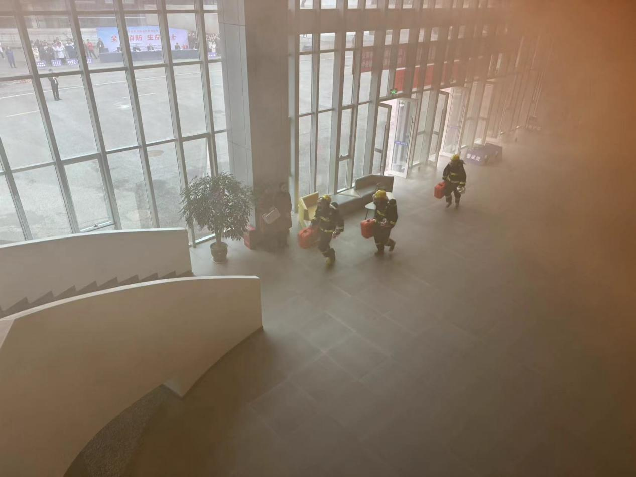 此次演练模拟园区检验检测中心大楼电器短路失火,造成楼内大面积起火,物业中心快速响应,启动消防应急预案,拨打119报警电话,组织人员有序撤离,进行初期火灾抢险,直至消防大队赶至现场,采用高压水枪作业并展开高空救援,最终扑灭火灾,并成功救出被困人员。各单位配合默契,演练达到预期效果。