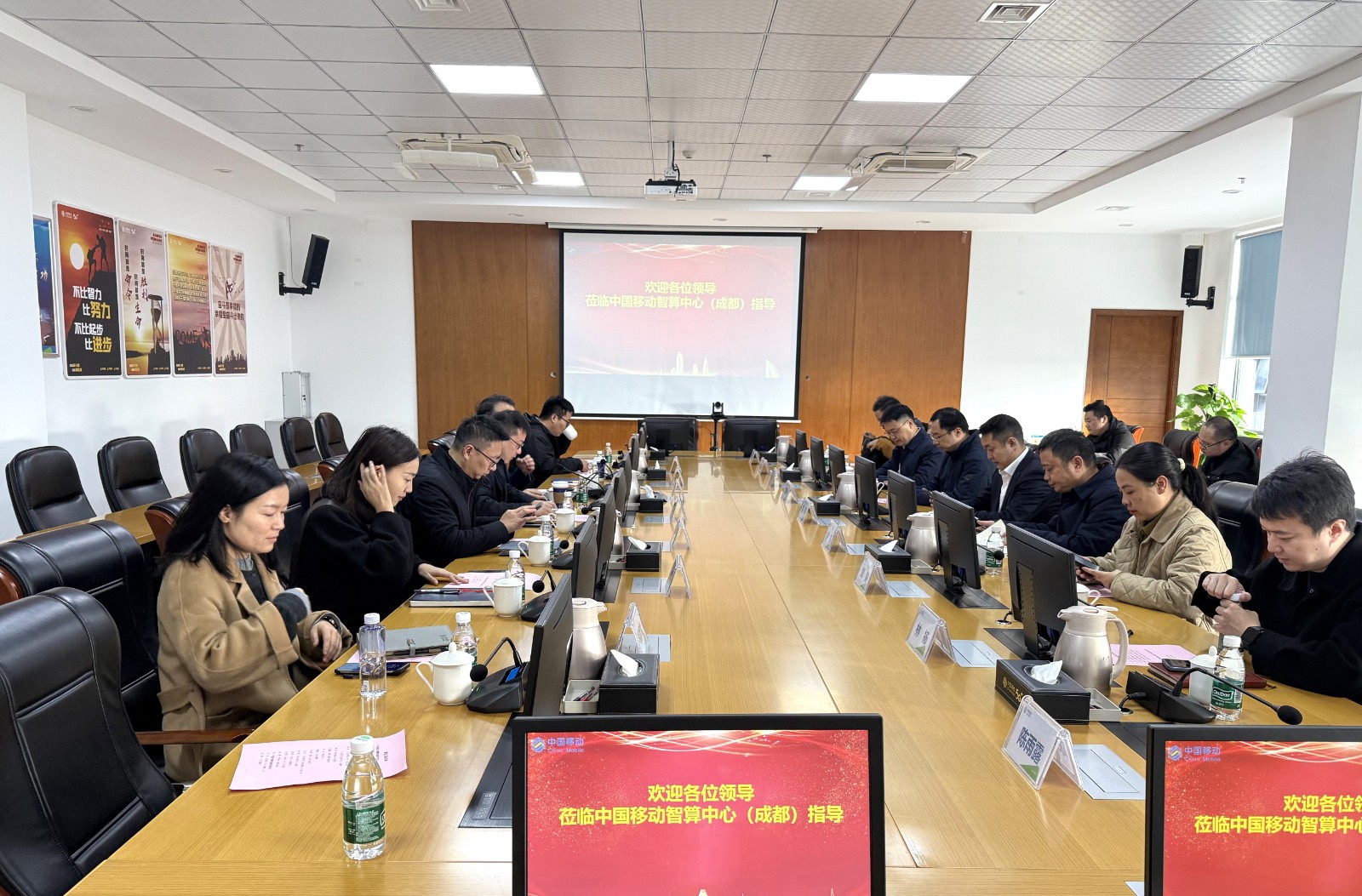 调研组一行实地参观了解智算中心在供电、制冷、网络及安防消防等方面的保障体系,以及其高效的节能措施等。四川移动有关领导介绍了中心基本情况、算力市场发展情况和中国移动在智算方面的布局和能力,以及对四川“电算融合”的思考和展望。